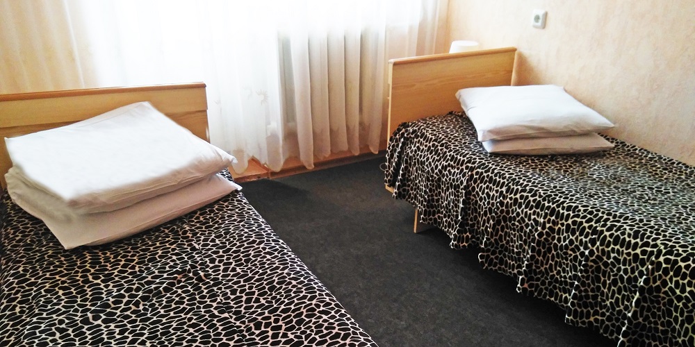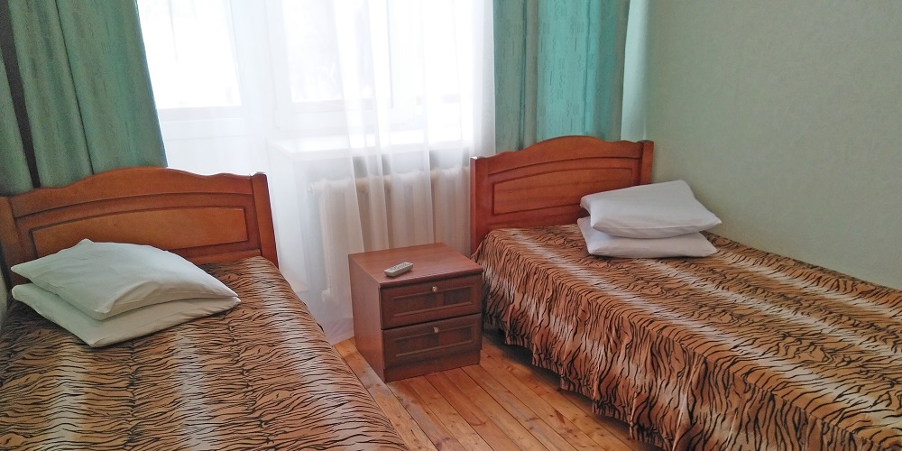В номере: две односпальные кровати, прикроватные тумбы, стол, стулья, шкаф-купе, холодильник, телевизор